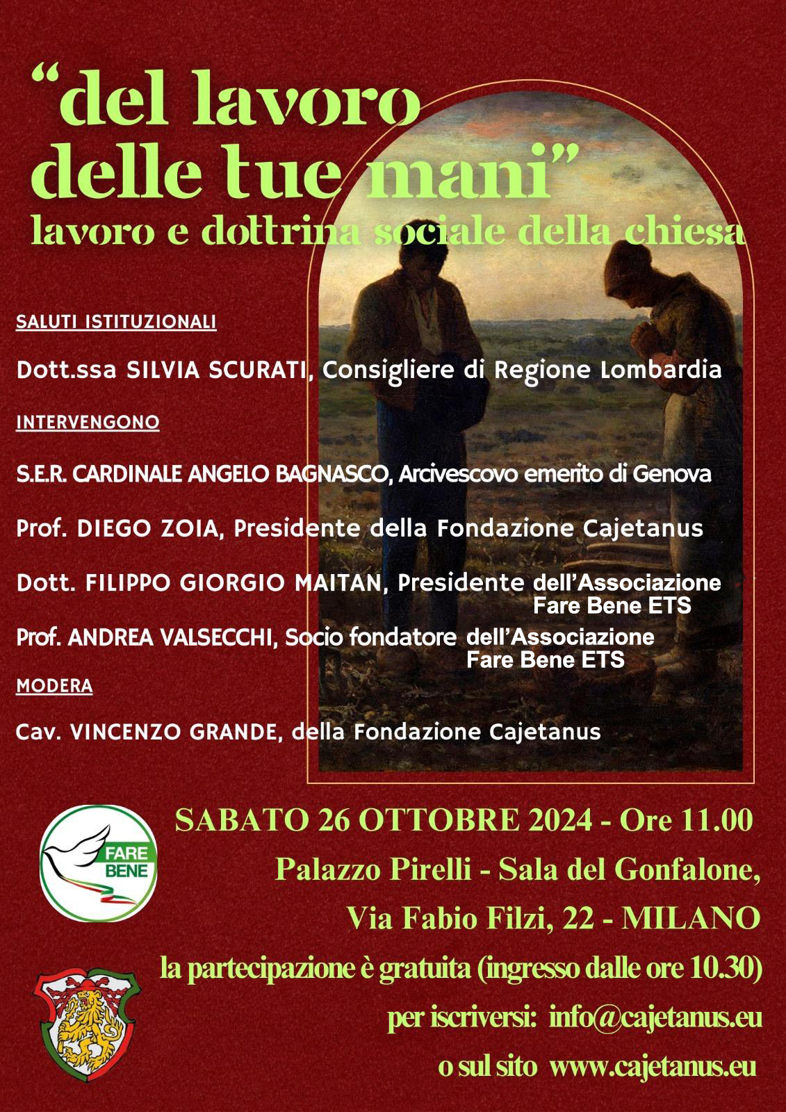 Con Silvia Scurati (Consigliere Regione Lombardia), S.E.R. Card. Angelo Bagnasco (Arcivescovo emerito di Genova), il Diego Zoia (Presidente Fondazione Cajetanus), Filippo Giorgio Maitan (Presidente Associazione Fare Bene ETS), Andrea Valsecchi (Socio fondatore dell’Associazione Fare Bene ETS) e Vincenzo Grande (Fondazione Cajetanus).